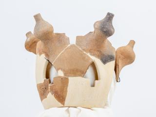 Leírás: hengeres palásttal, gyorskorongon készült tárgy darabjai. A palást belső oldalán finom korongolásnyomok láthatóak. A paláston kívül, szabályos elrendezésben korongolással készült, csúcsos, gombszerű rátétek láthatóak. A paláston, a gombok közötti részeken, legalább két sorban nagyjából egyenlő szárú háromszög formájú, levélszerű kivágások láthatóak, amelyek alul, a háromszögek talpán középen négyszög vagy téglalap alakú kivágásban zárulnak, mintegy szárként. A levélszerű kivágások közül többnek csak a részletei figyelhetők meg. A paláston még nyers állapotban vágták ki a mintát. Az oromdísz palástja külön, enyhén domború testként készült, arra illesztették rá egyenletes távolságban a szintén külön korongolt gombokat, majd a felületet lesimították.